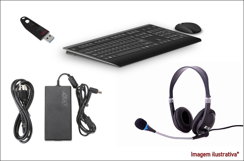 Fontes e cabos de força, Pendrivers, Fones headset, teclado e mouse e diversos adaptadores.