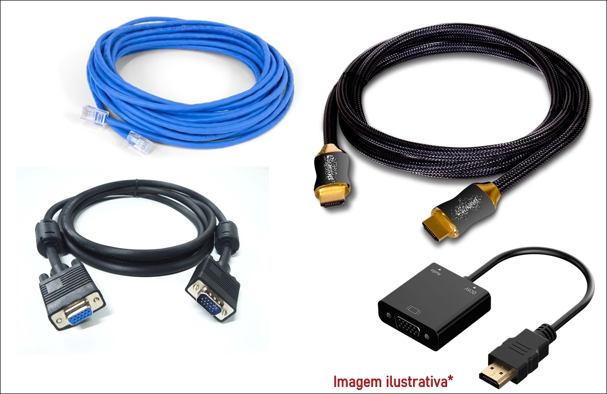 VGA, HDMI, adaptadores e Cabo de Rede.