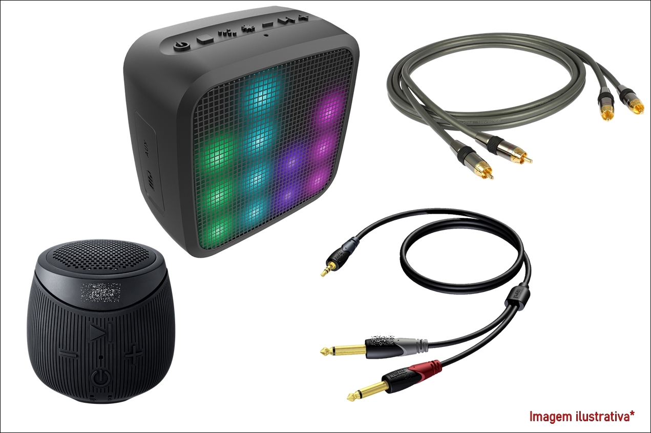 Caixas acústicas Bluetooth, cabos RCA e adaptadores.